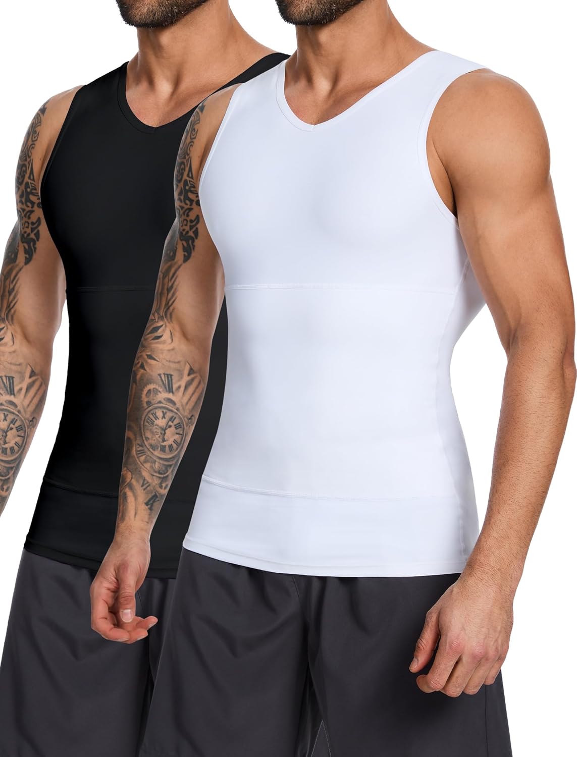 - 💪 DOUBLE LAYER COMPRESSION SHIRT: Double layer panels mid-abdomen of men tights shirt provides optimal compression effect for the waist, fully wrapping your tummy, while nicely tightening the belly fat. Seamless body shaper features v neck sleeveless chest binder tank top on upper chest and back design hiding “man boobs” to prevents dew points and helping tighten back muscles to straighten your posture.